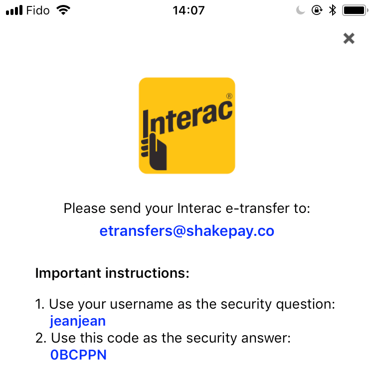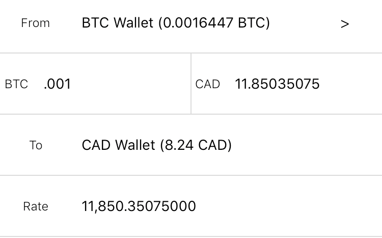 In the CAD wallet, you can add funds via Interac e-transfers. This step requires that you copy paste the security question and security answer into your bank application when creating the e-transfer. It’s a little tedious but we’re working on making this whole process much easier.