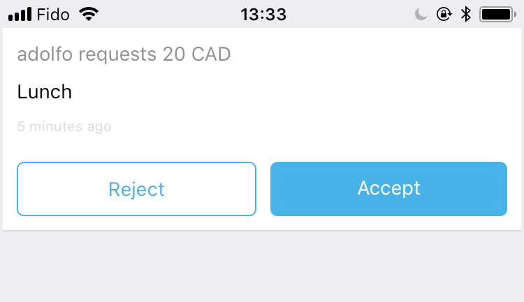 Similarly, you can send out payment requests for amounts in CAD and BTC. The requests can be Accepted or Rejected from the Notifications tab. Users receiving a payment request will get an app notification so make sure to enable them on sign up!