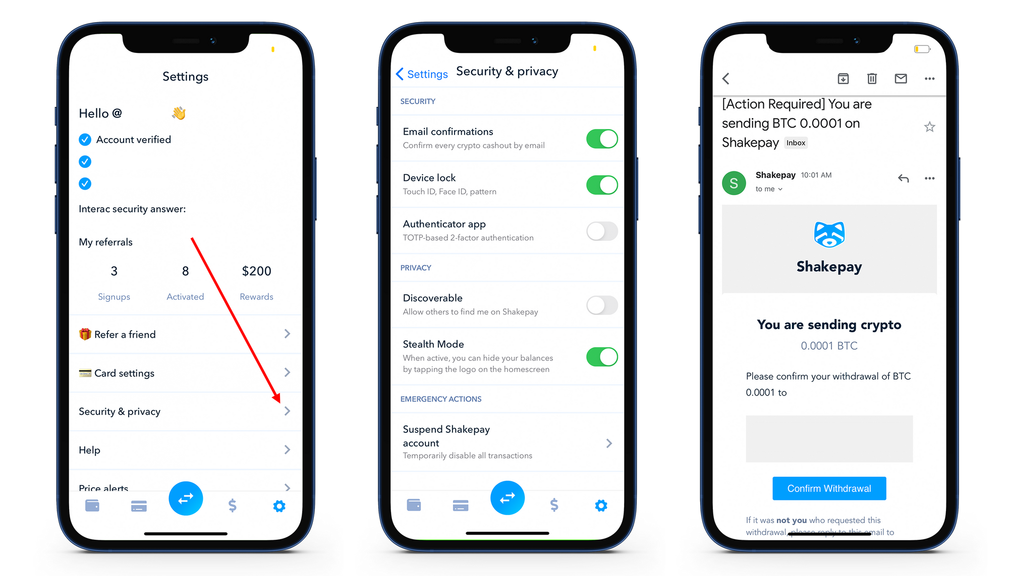 To reduce the risks of someone stealing your bitcoin, Shakepay has built security features like our app PIN or biometrics lock, e-mail confirmations for cashouts, login notifications, and 2-Factor Authentication for all account logins.