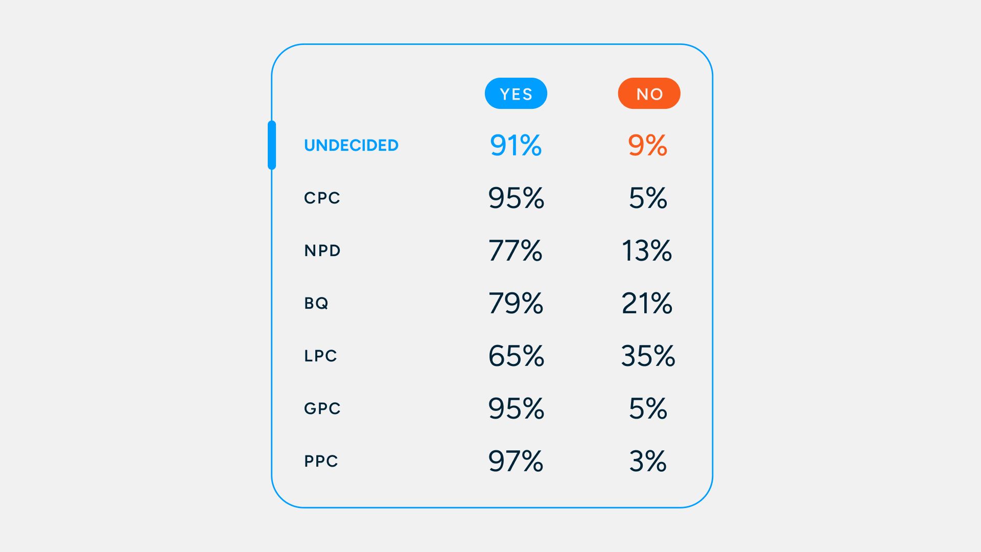 Our survey shows that 39% of undecided voters previously backed LPC or NDP, but now appear to be looking for leadership that aligns with their vision of financial freedom.